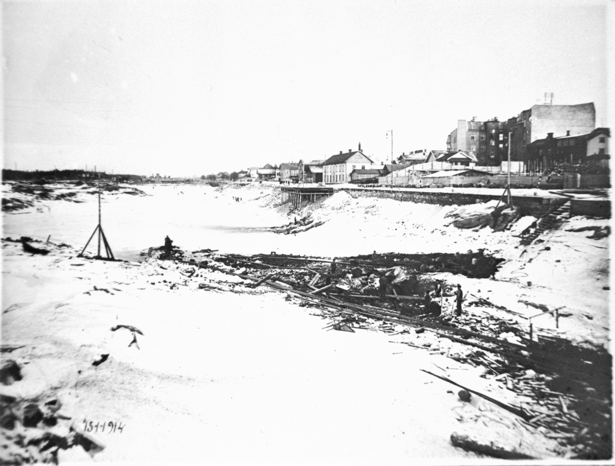 Trafikkanalen under byggnad norr om klaffbron. Stadshuset till höger under byggnad. Trollhättan