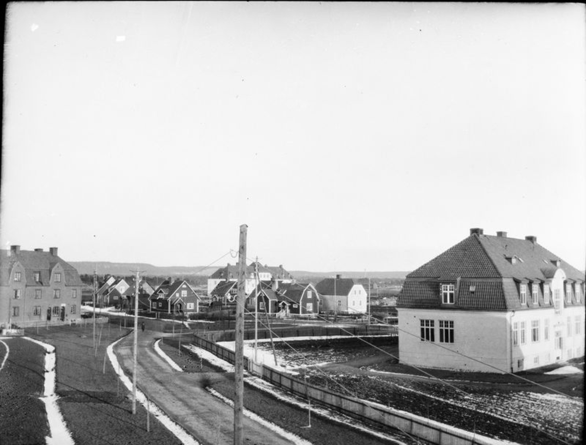 Epidemisjukhuset Vänersborg norra flygel till höger. Vårdhemmet, Torpafältet i bakgrunden.