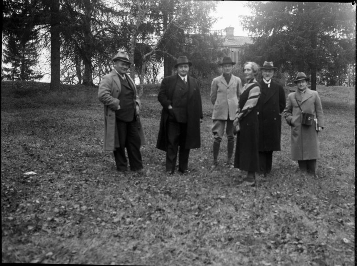 Vid Hajoms skans. Holmedals sn Från vänster vägingenjör Ahlin, landskamrer Wennerström, kyrkoherde Stake, fr. Olsson, kamrer Östlund, N I Svensson.