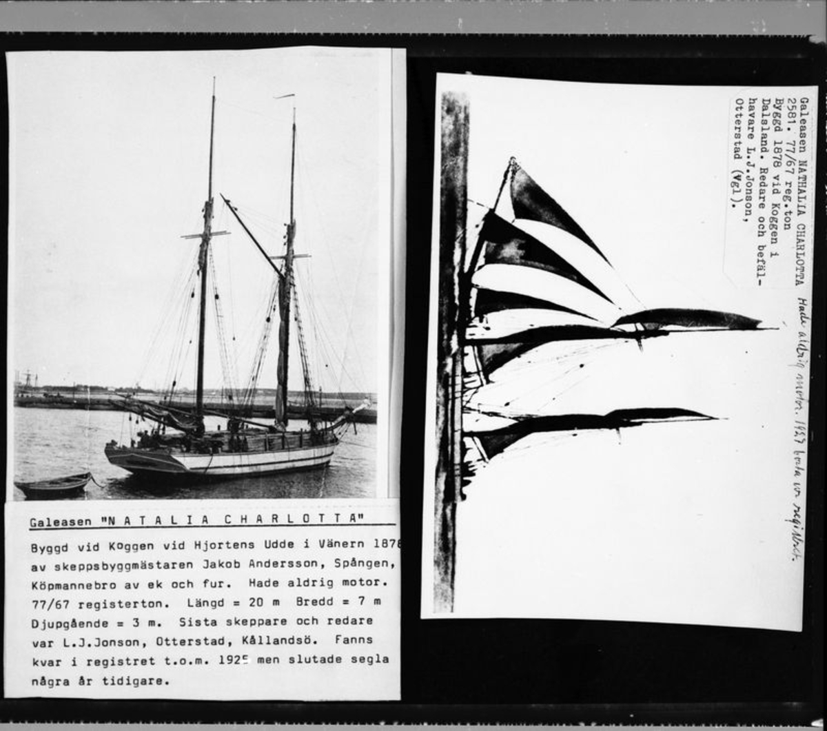 Galeasen Natalia Charlotta.Byggd vid Koggen vid Hjortens udde i Vänern 1878 av skeppsbyggmästaren Jakob Andersson, Spången,Köpmannebro av ek och fur. Hade aldrig motor.77/67 registerton.Längd = 20 m. Bredd = 7 m. Djupgående = 3 m. Sista skeppare och redare var L. J. Jonsson, Otterstad, Kållandsö. Fanns kvar i registret till och med 1925 men slutade segla några år tidigare.