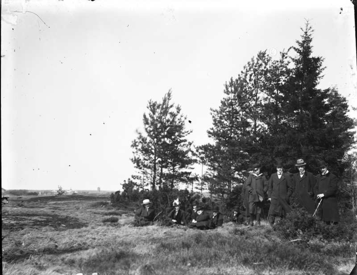En grupp okända. I bakgrunden skymtar ett vatten och kyrktorn. Är det Vänersborg torde bilden vara tagen ifrån Torpaområdet.