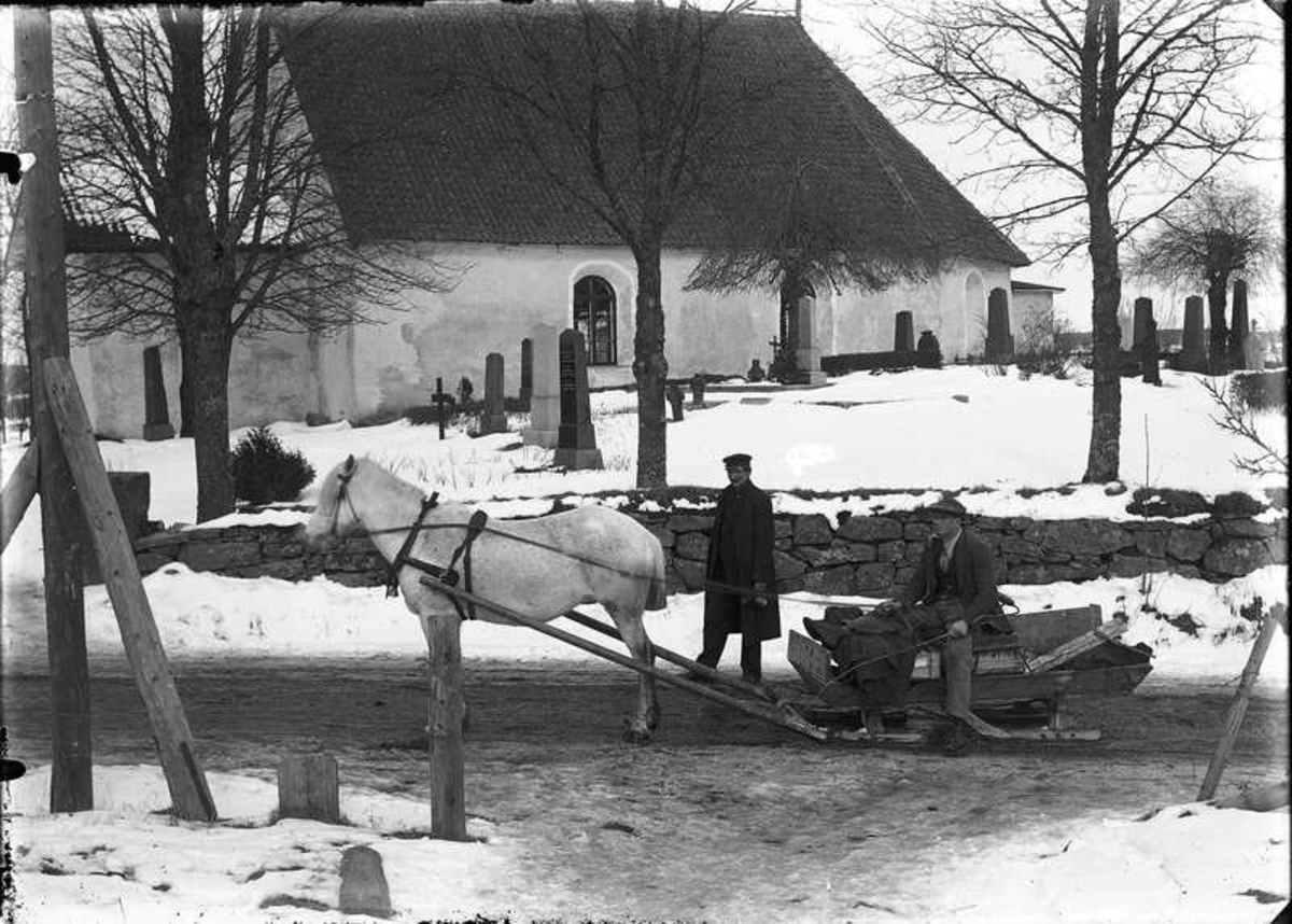 Häst med släde framför kyrka.
