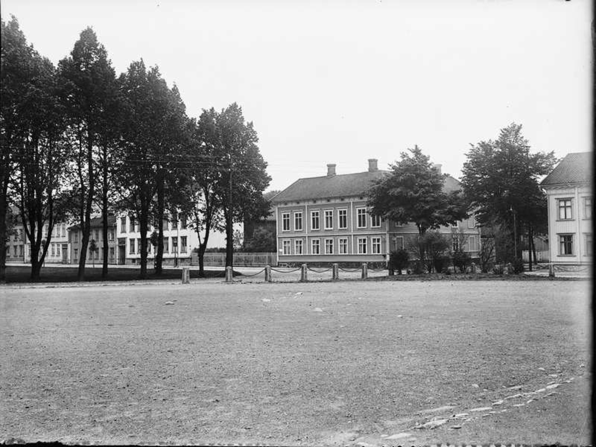 Hus på Drottninggatan. Fotograferat från planen framför gamla läroverket.