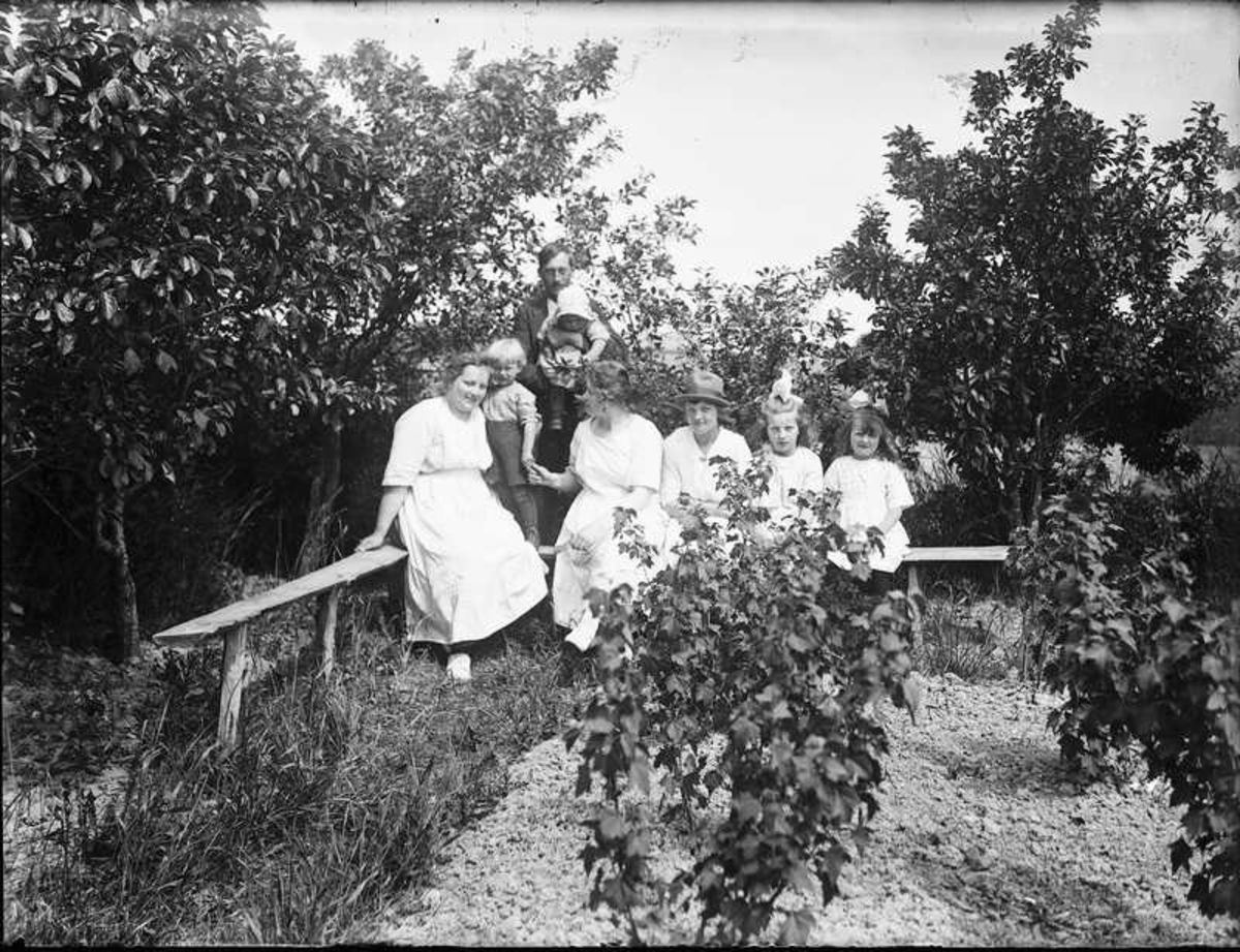 Åtta personer utomhus vid frukt och bärodlingen.