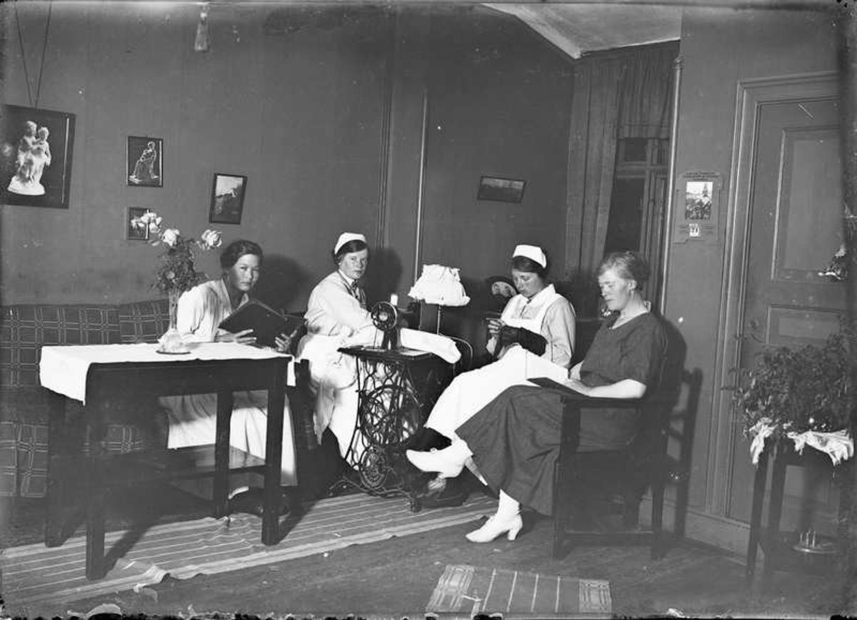 Fyra kvinnor, ev. sjuksystrar el. liknande, sysselsatta med läsning och sömnad. På almanackan kan man läsa Elektriska aktiebolaget Wahlqvist & Andell Vänersborg. Datumet är 21 och troligen en sommarmånad. Årtalet okänt men runt 1920.