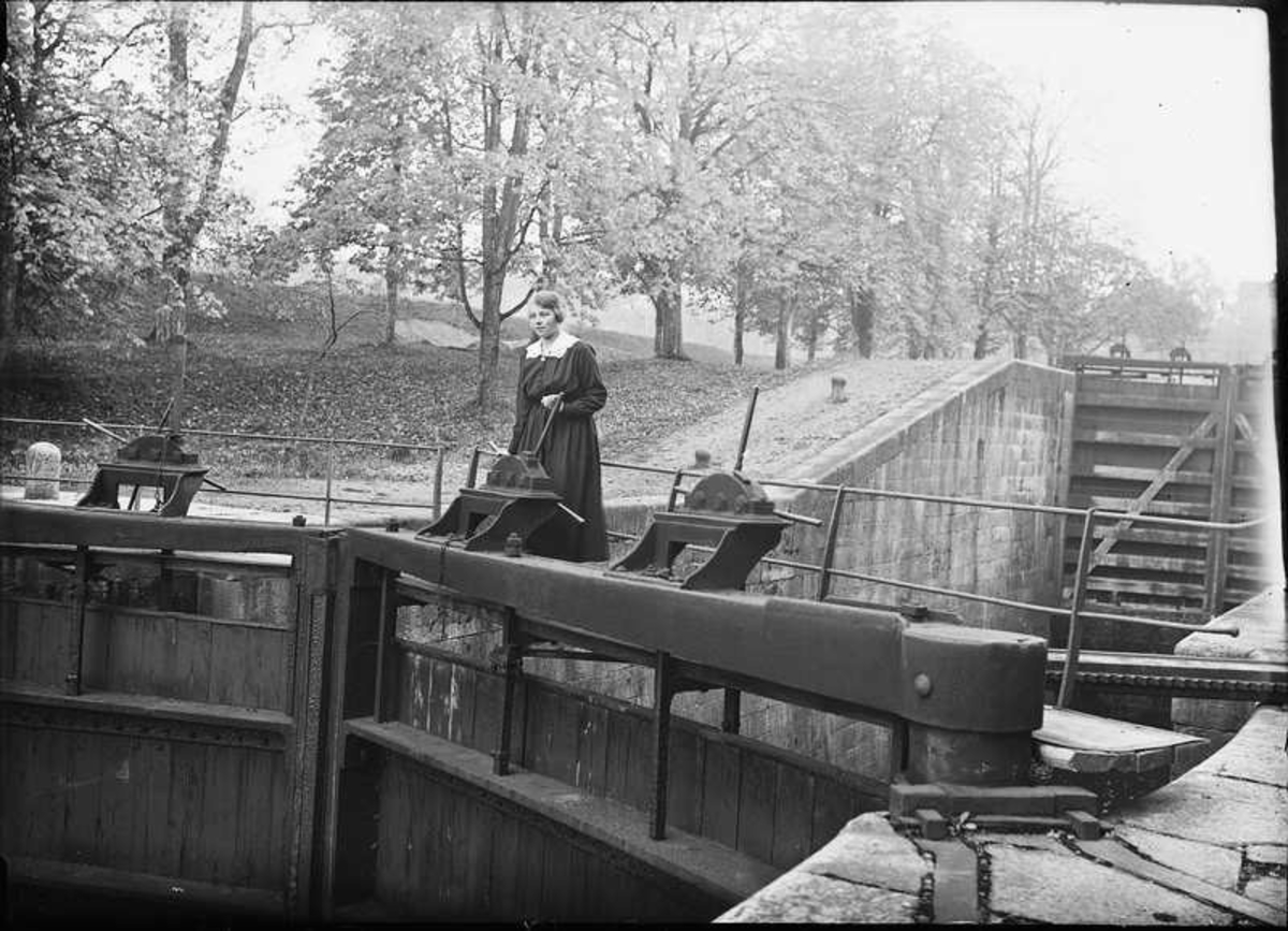 Kvinna på slussport. Del av 1844-års linje i Trollhättan.