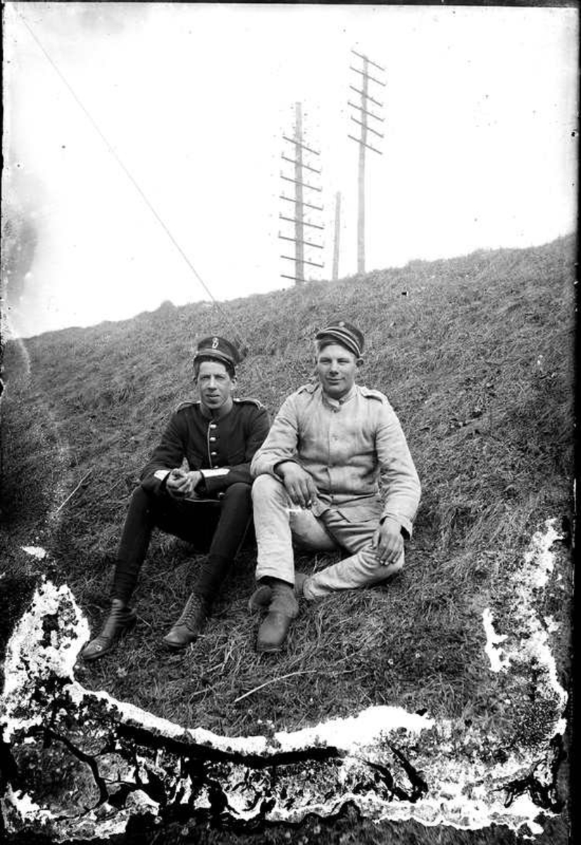 Två unga män. Okänt vad dom jobbar med. På deras mössor sitter ett märke med en 2:a på.