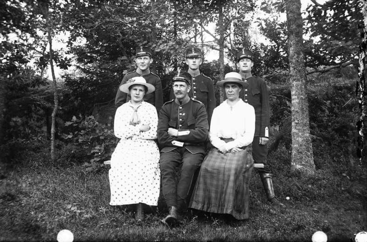 Grupporträtt. Fyra män och två kvinnor. Männen bär uniform.