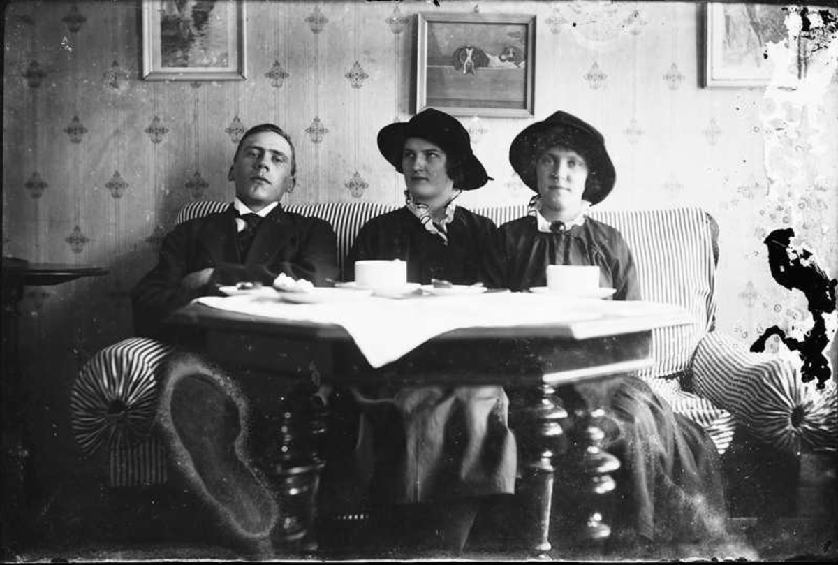 Två kvinnor och en man sittande i soffa.