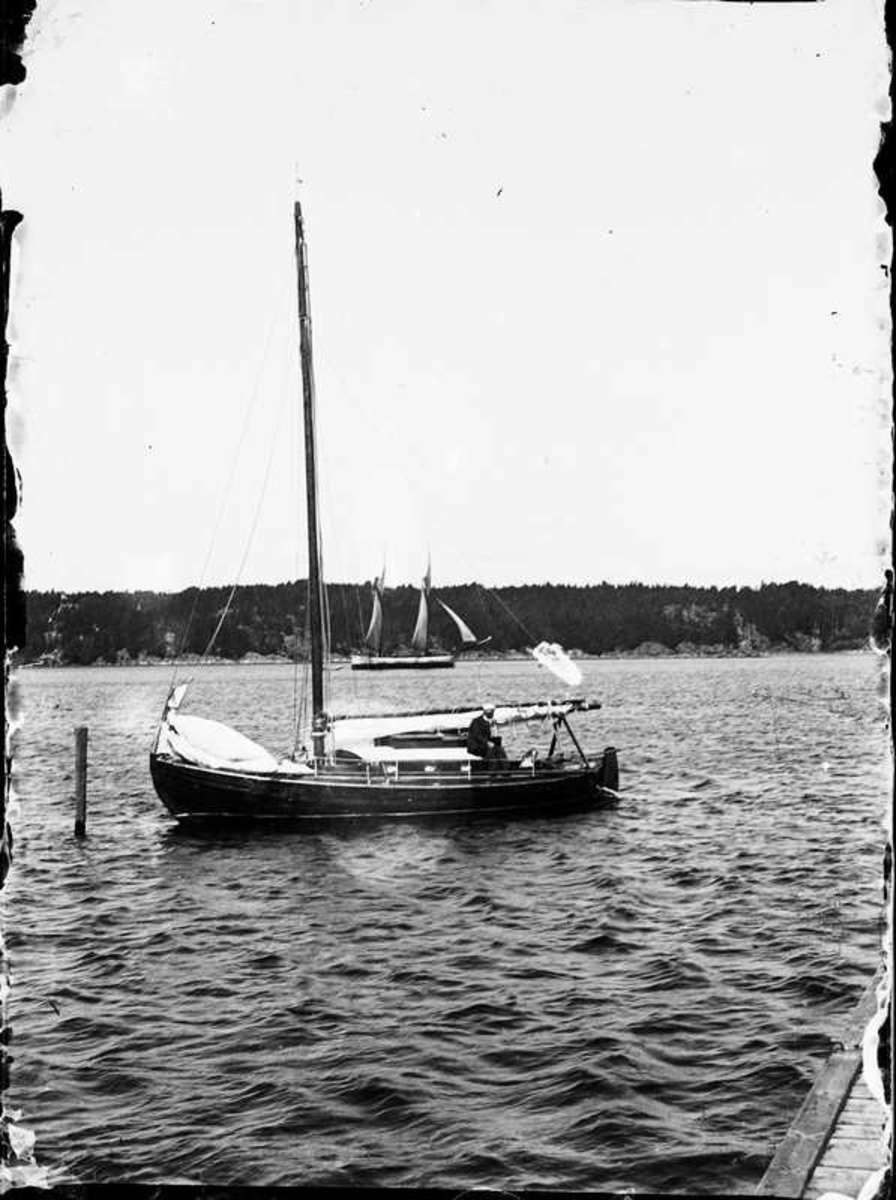 Två båtar, en fritidsbåt samt en farktskuta (galeas) i bakgrunden.
