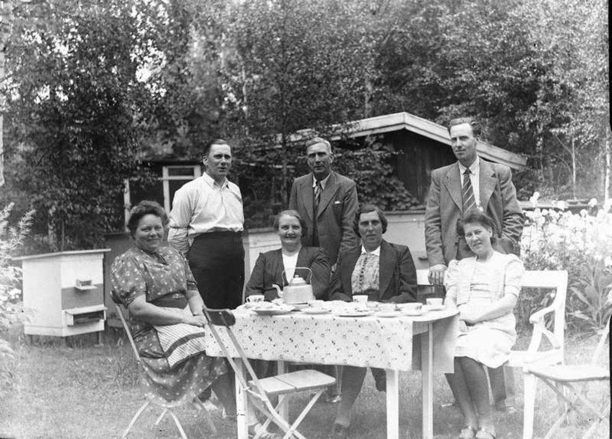 Kaffedrickande i trädgården. Mannen till vänster är troligen fotografen själv.