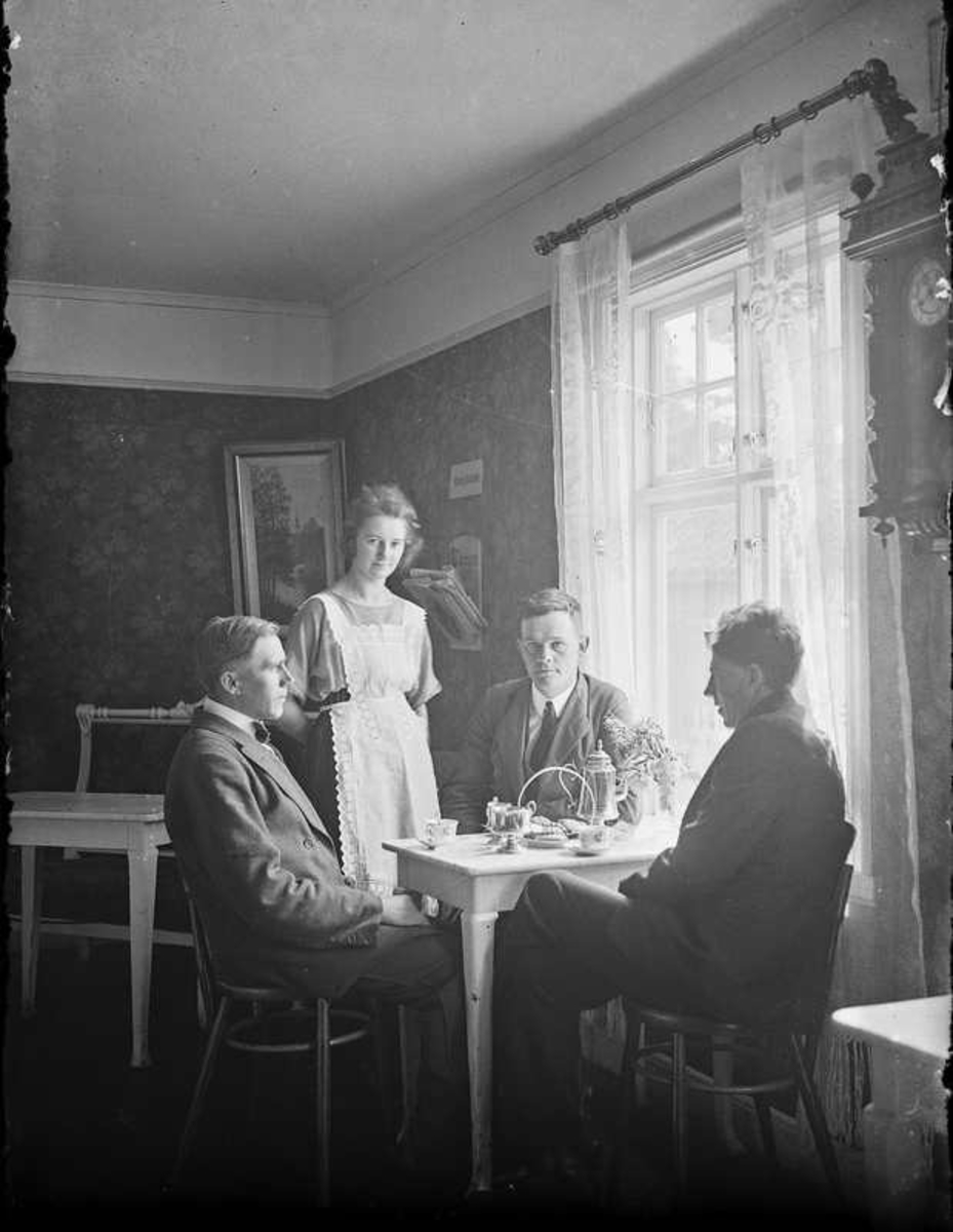 Tre herrar och kvinnlig servitris.