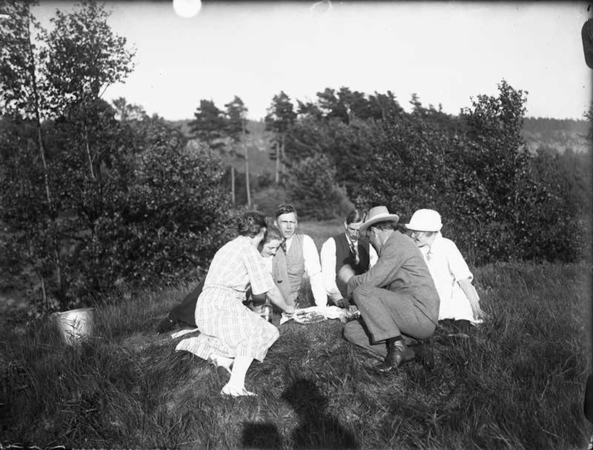 Sex personer fikar utomhus. Halle el. Hunneberg i bakgrunden.