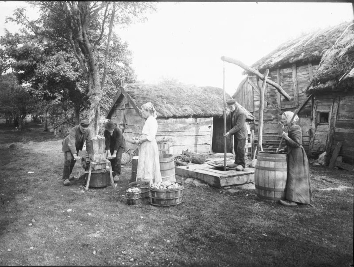 Potatismalning, i bakgrunden boa. Ladugården t h byggd 1754, nedriven 1927. Grimstorp Hudene