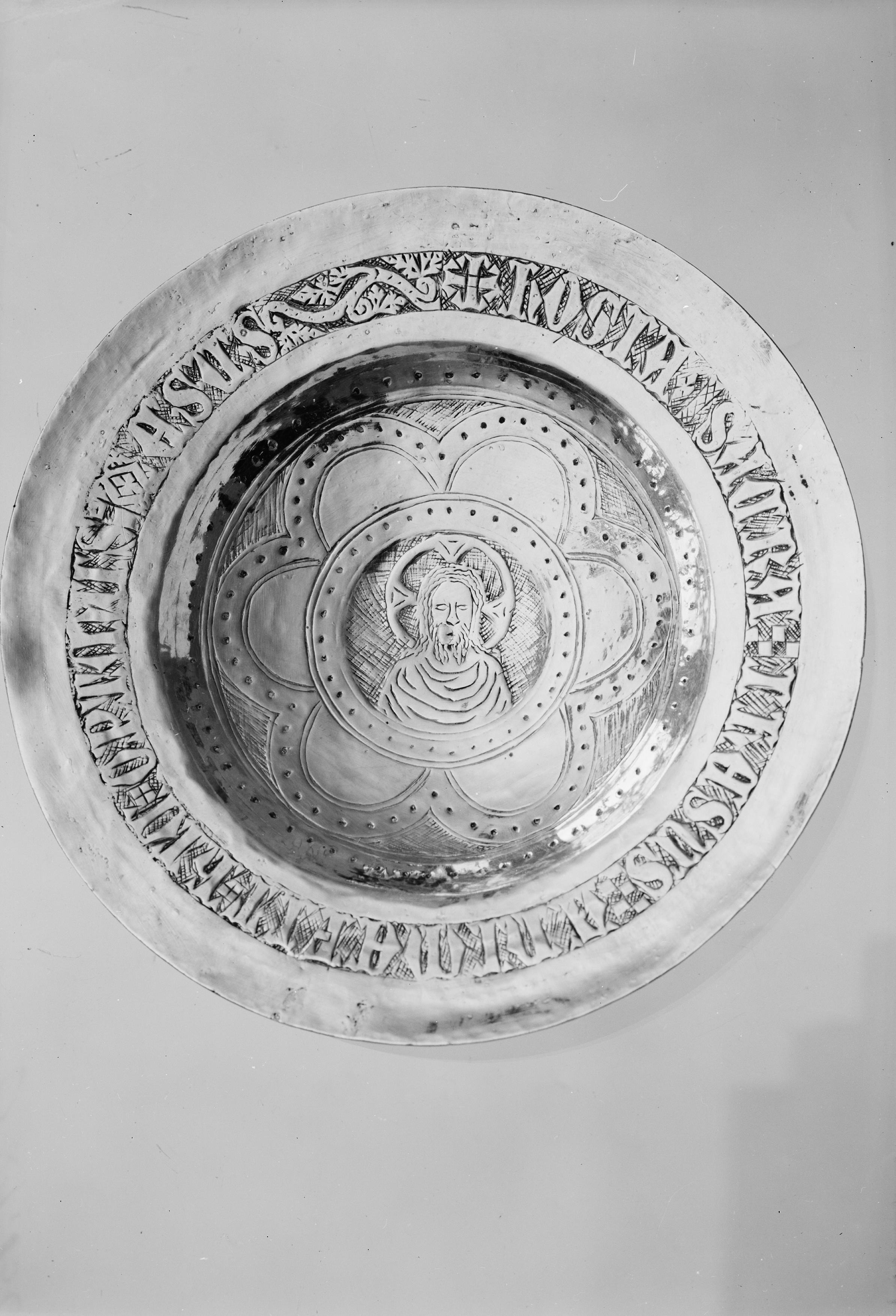 Paten, förgyllt silver, bottengravyr föreställande Kristus med korsgloria, 1300-talet.