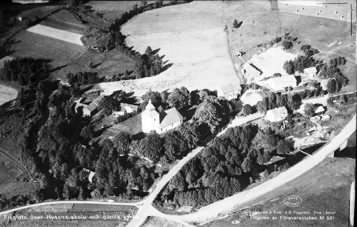 Flygfoto över Hyssna gamla Kyrkan och Skolan