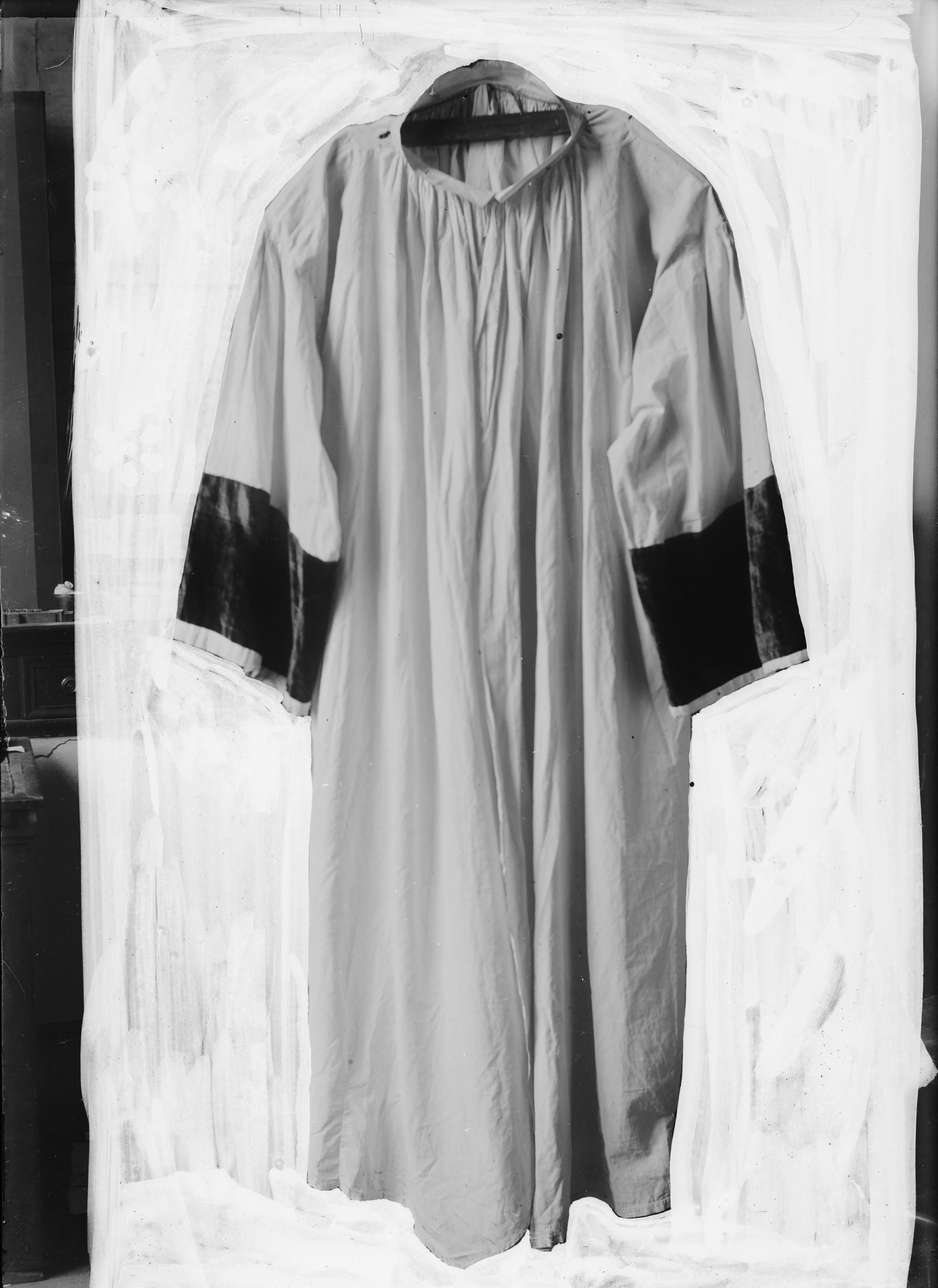 Mässkjorta. Vitt linne med röda sammetsbesättningar på armarna. Veckad i hals, uppstående krage.