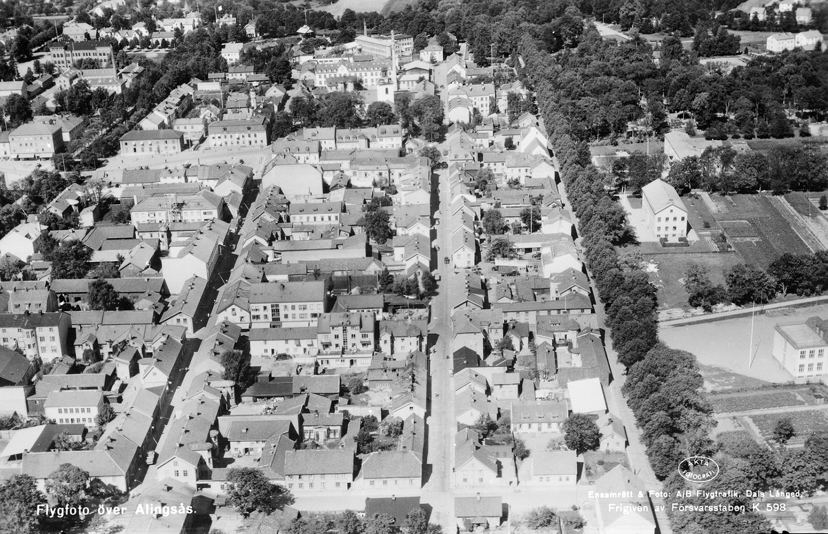 Text på bild:" Flygfoto över Alingsås" Innerstaden österifrån