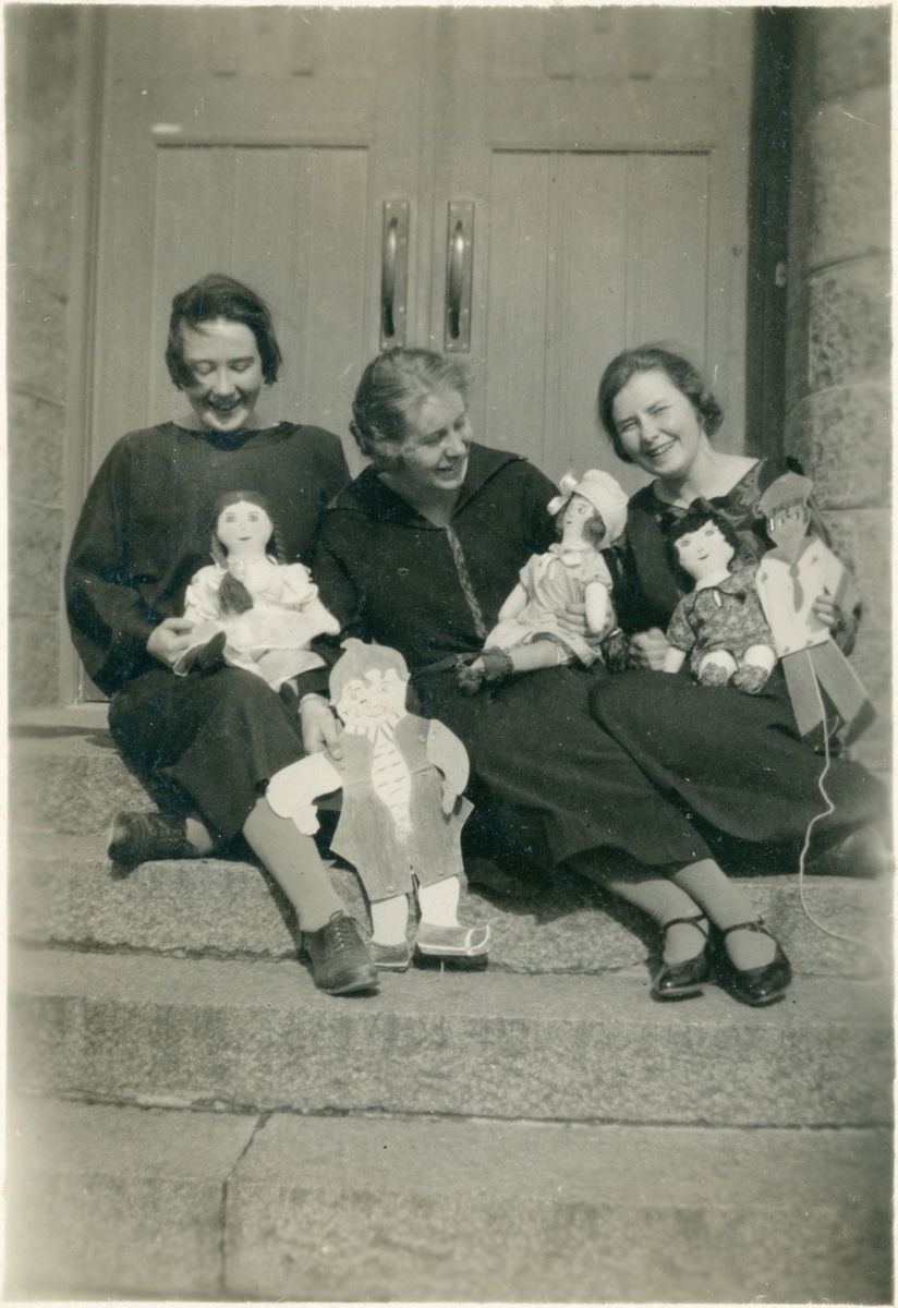 Hagsta. Tre kvinnor med dockor och "sprattelgubbar"