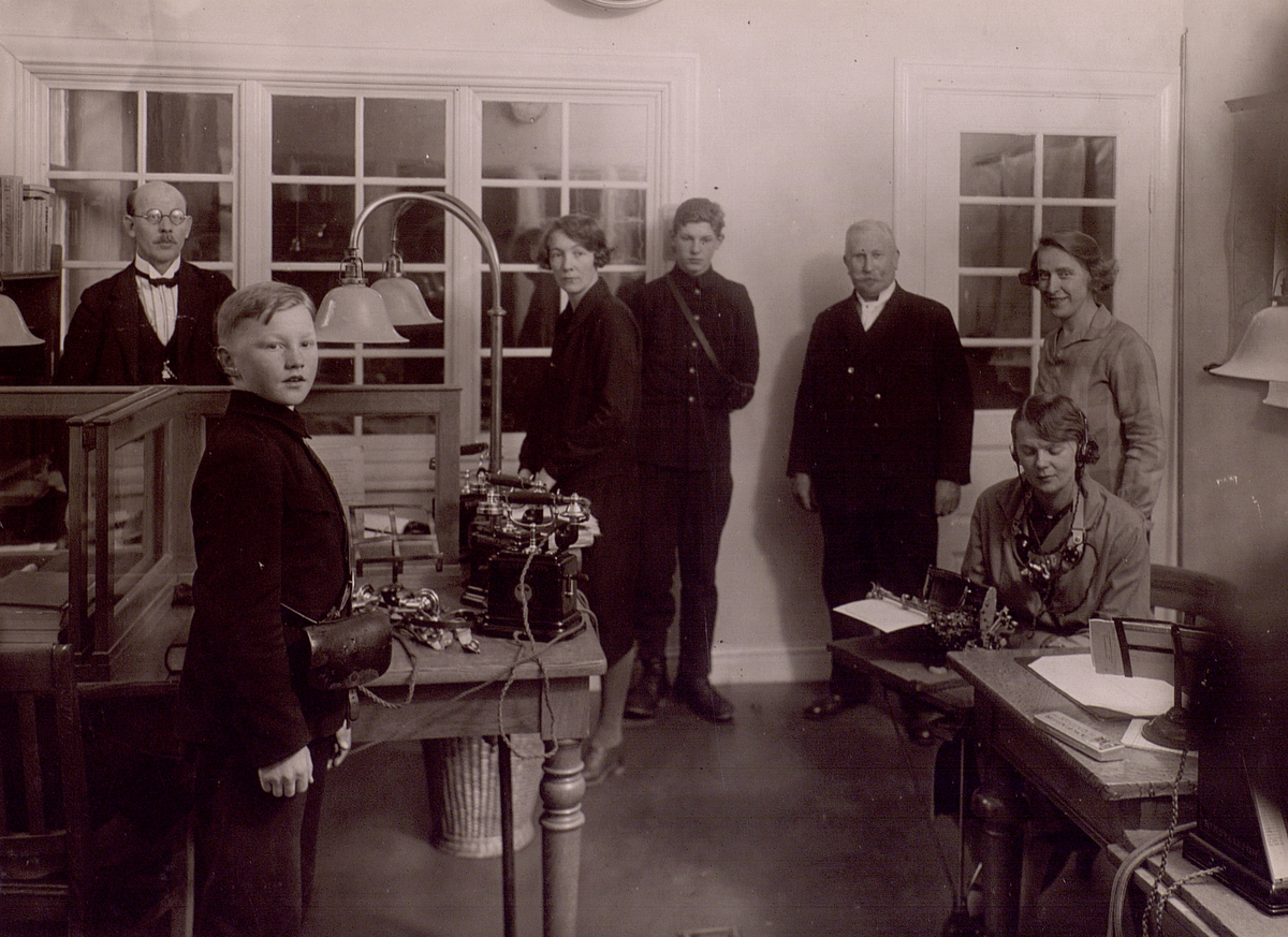 Sundsvall telefonstation omkr. år 1930. Gruppfoto. Rtgf C. Johnson, tgmb B. Pettersson, telefonist R. Johansson, Tgmb C. Olsson, tgd A. Vedholm, Tgx S. Hand.