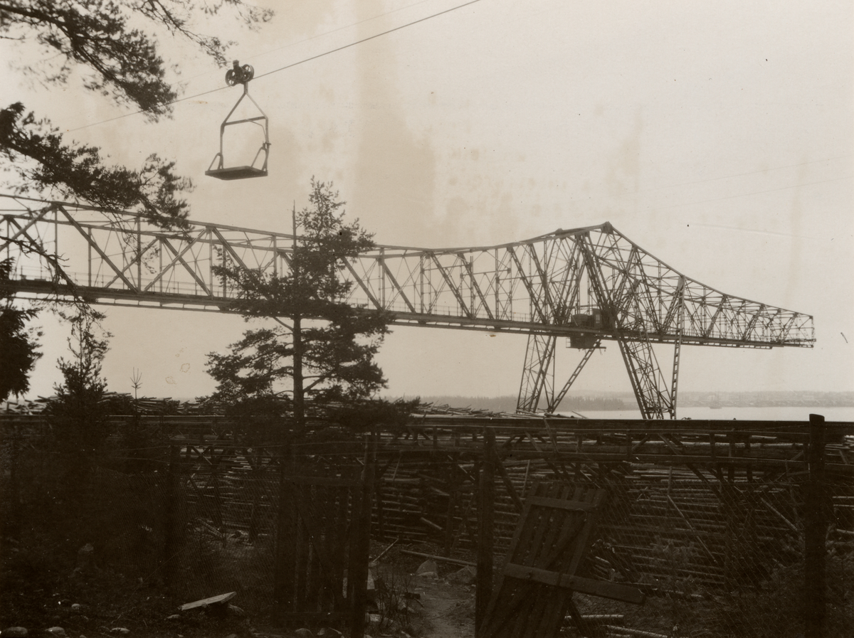 Obbola sulfatfabrik vid Holmsunds AB i Holmsund, Västerbotten. Brokran för massaved.