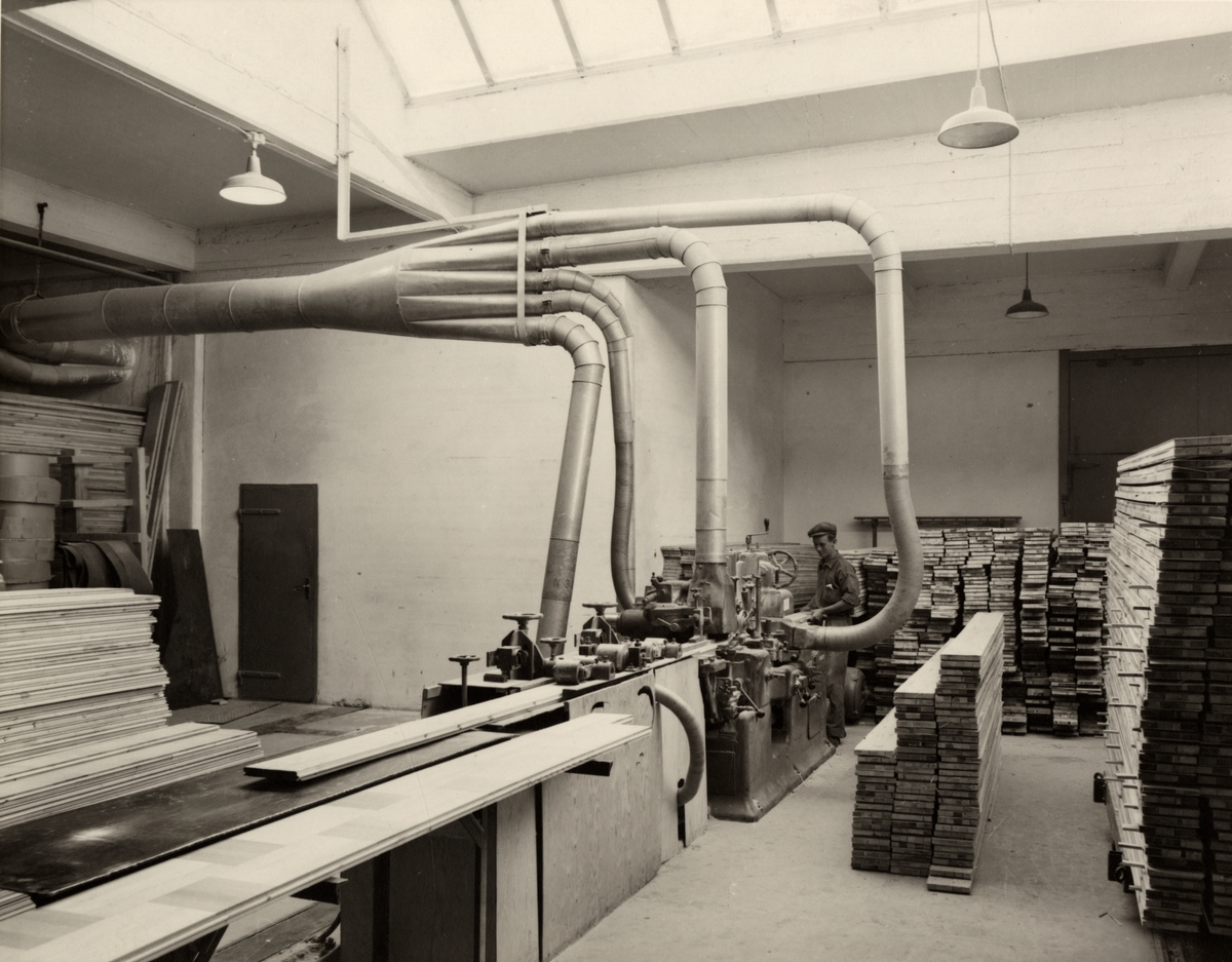 Golvtillverkning vid Holmsunds AB. Lamellbrädorna maskinslipas.