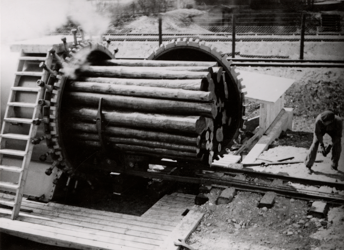 Virke uttages efter arsenikimpregnering från en cylinder i en tryckanläggning, Boliden 1942. Bolidens Gruv AB.