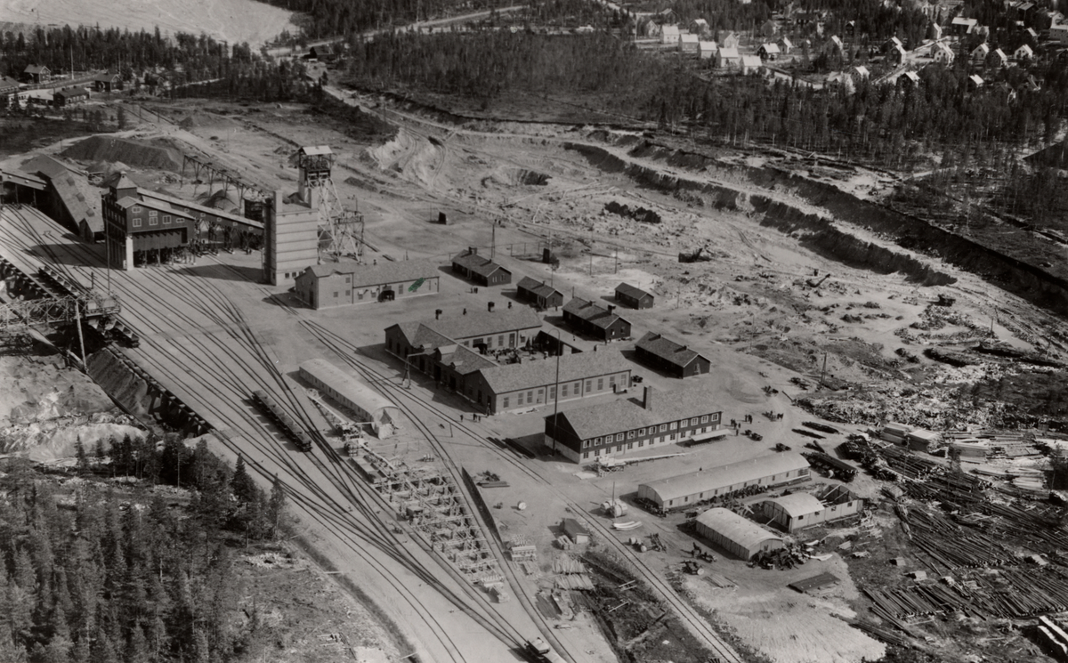 Flygfoto över anläggningar och jordavrymning vid Bolidens Gruv AB.