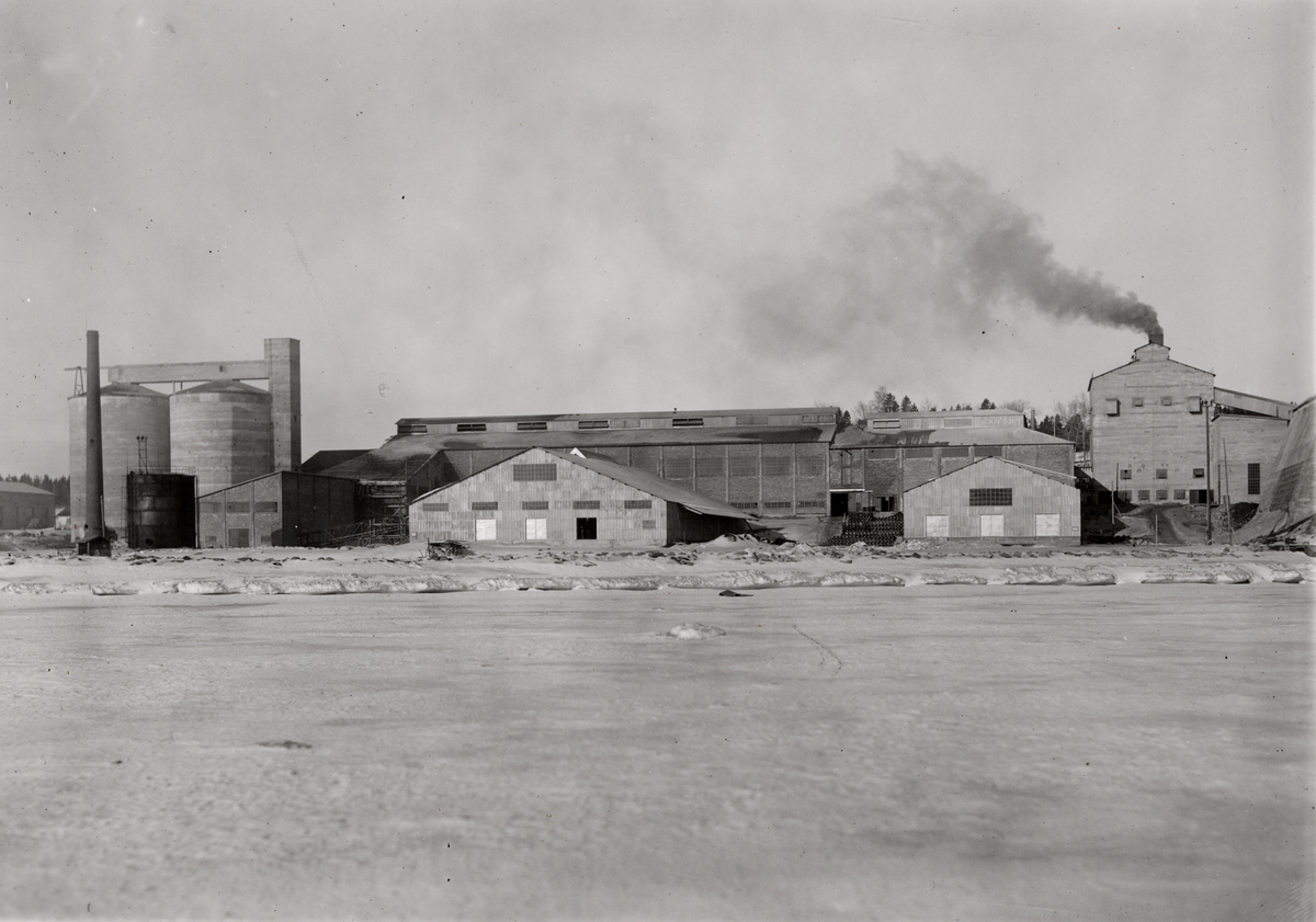 Stockholms Superfosfat Fabriks AB, Stockviksverken söder om Sundsvall. Från vänster: Vätgas- och kvävgasklocka, kalkkvävefabriken och karbidfabriken.