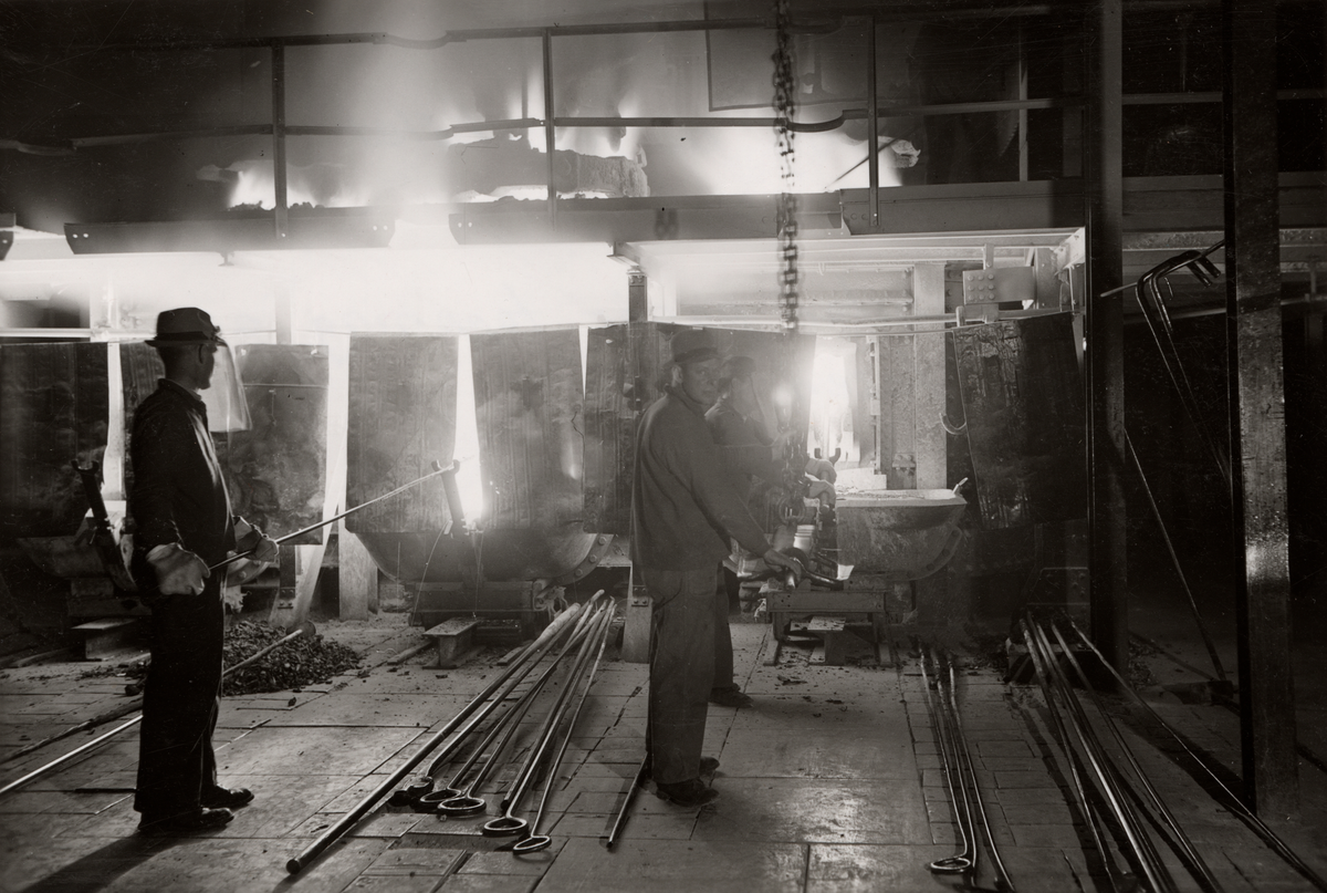 Stockholms Superfosfat Fabriks AB, Alby Karbidfabrik. 3-fas karbidugn. Igensättning av tapphålet med "lansen". Till vänster pågår tappning av mellersta fasen.
