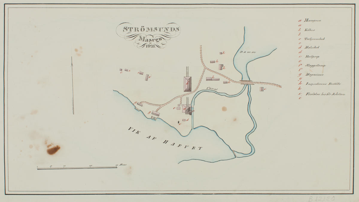 Originalritning över Strömsunds Masugn 1828. Ur Kartbok och ritningar över H M Konungens egendomar i Norrbotten och Luleå Lappmark. Författad av Franz von Scheele.