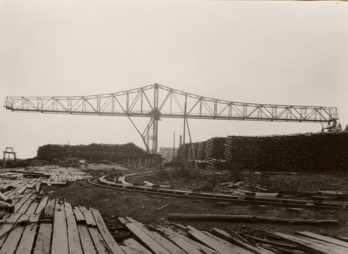 Obbola sulfatfabrik vid Holmsunds AB i Holmsund, Västerbotten. Brokran för massaved.