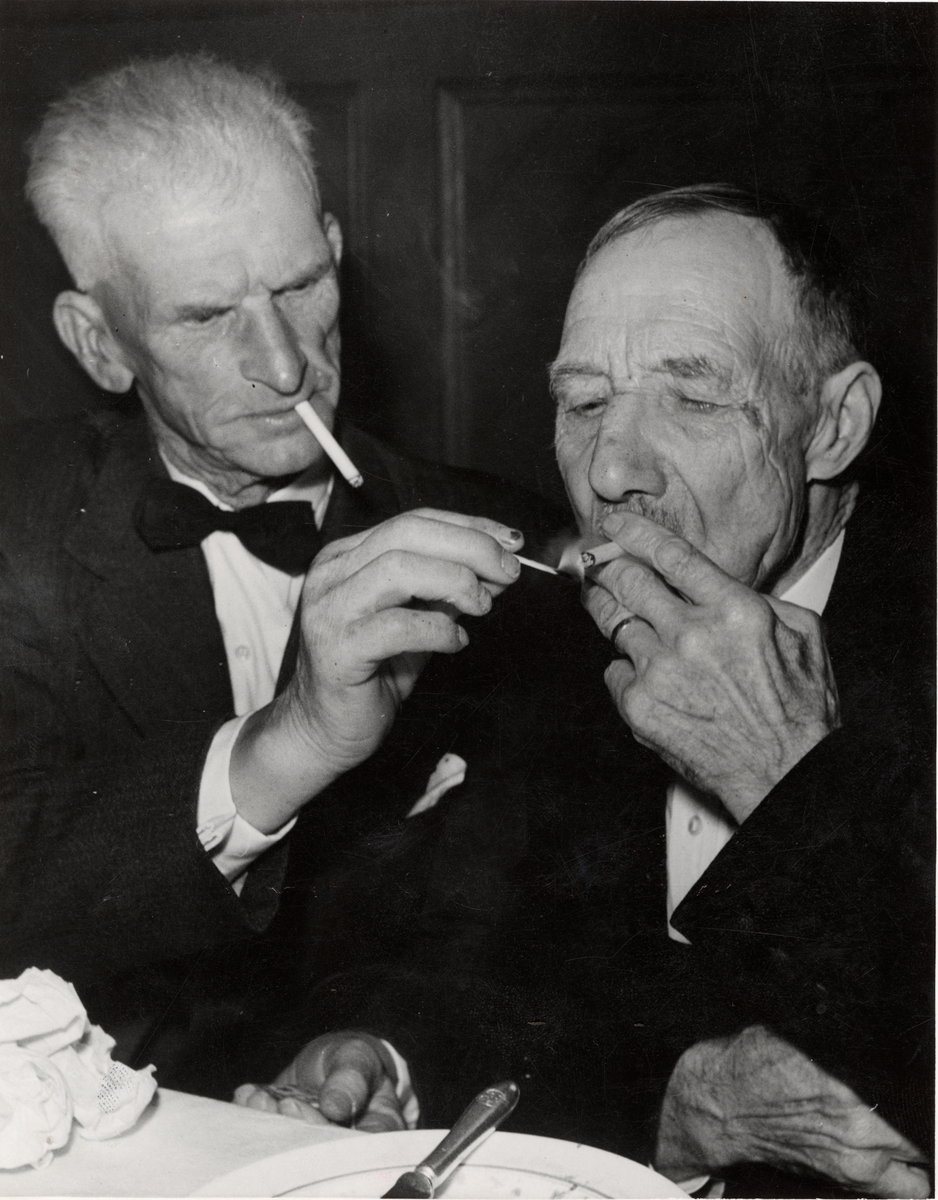 Wifsta Varfs AB i Timrå. Jubileumsmiddagen för sågverksarbetarna den 15 september 1948 i samlingslokalen på den forna varvsplatsen. Från vänster sågverksarbetaren Gustaf Söderlund med 62 tjänsteår och snickaren A. E. Holmberg med 54 tjänsteår.