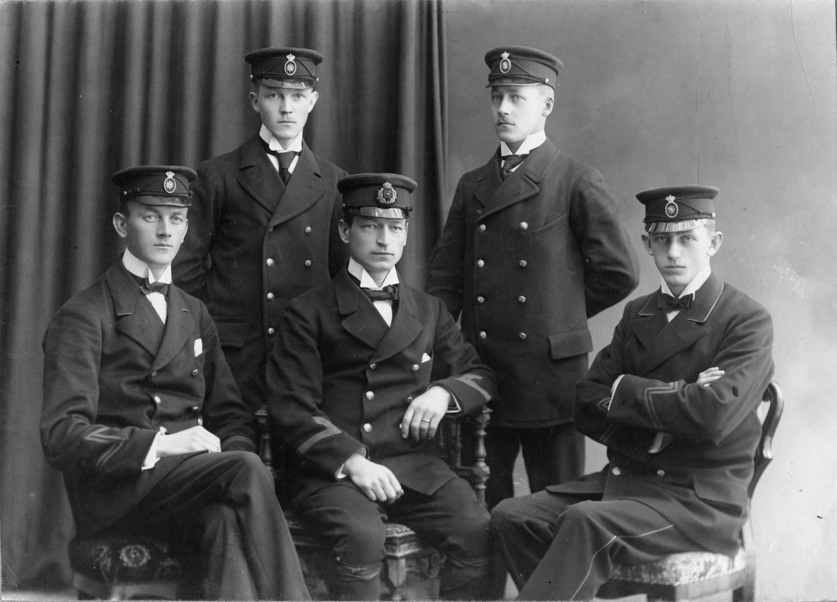 Personalen vid Boden Radio våren 1917. Wikström, Widergren Lindström, Jeuner och Holmström.