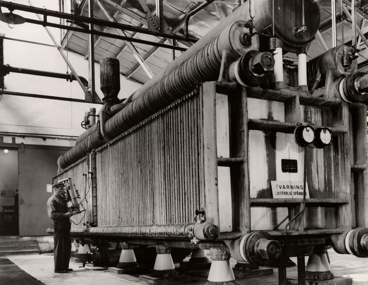 Stockholms Superfosfat Fabriks AB, Ljungaverk. Vattenelektrolysör enligt Bamag vid Ljungaverk för framställning av väte och syre.