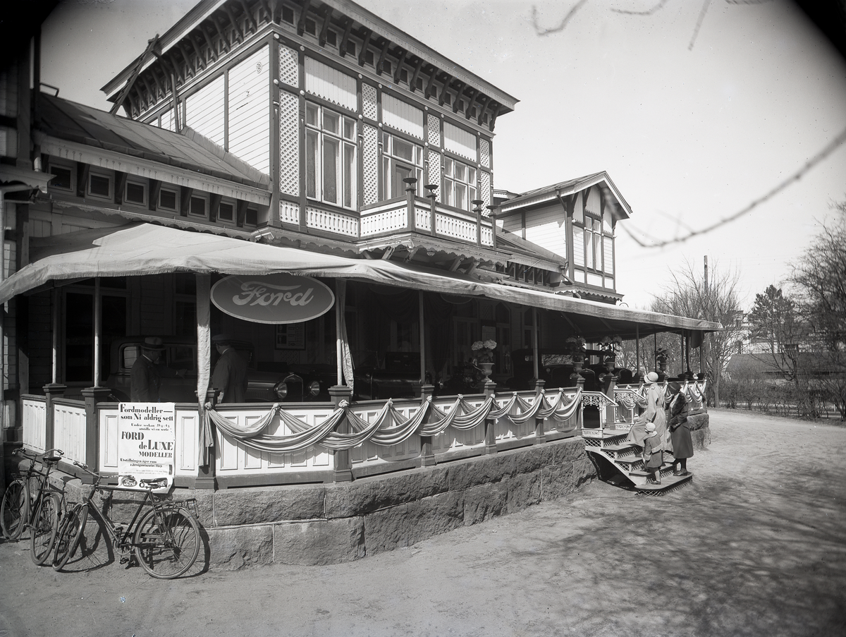 Titel: Davidssons har bilutställning på Järnvägsrestaurangens veranda i Museiparken. 1928.