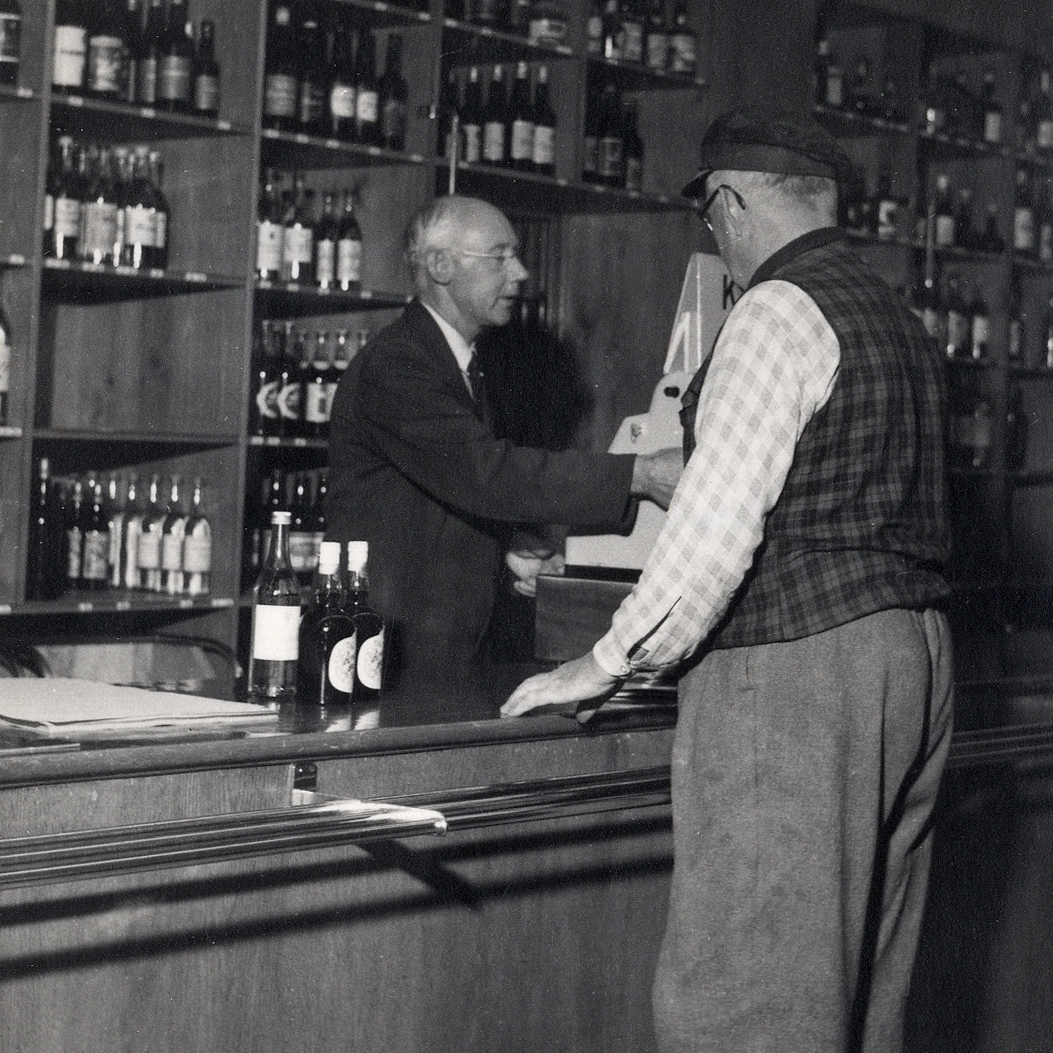 Växjö systembolag, 30 sept 1955. Sista dagen för motboken. Carl Johansson säljer till åkare Carl Friman.