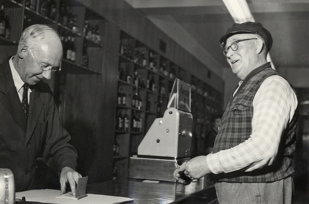 Växjö systembolag, 30 sept 1955. Sista dagen för motboken. Carl Johansson säljer till åkare Carl Friman.