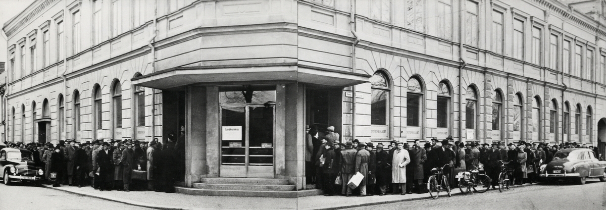 Växjö systembolag,ca 1960. Dubbla köer till entrén. Hörnet Klostergatan - Norra Järnvägsgatan.