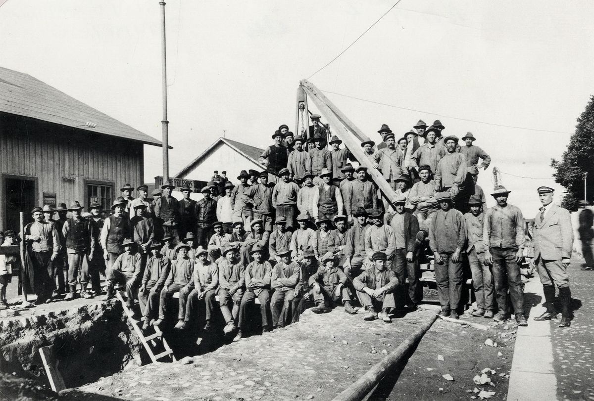 Gatuarbete på Liedbergsgatan, Växjö. Gruppfoto av arbetarna. Ca 1935.