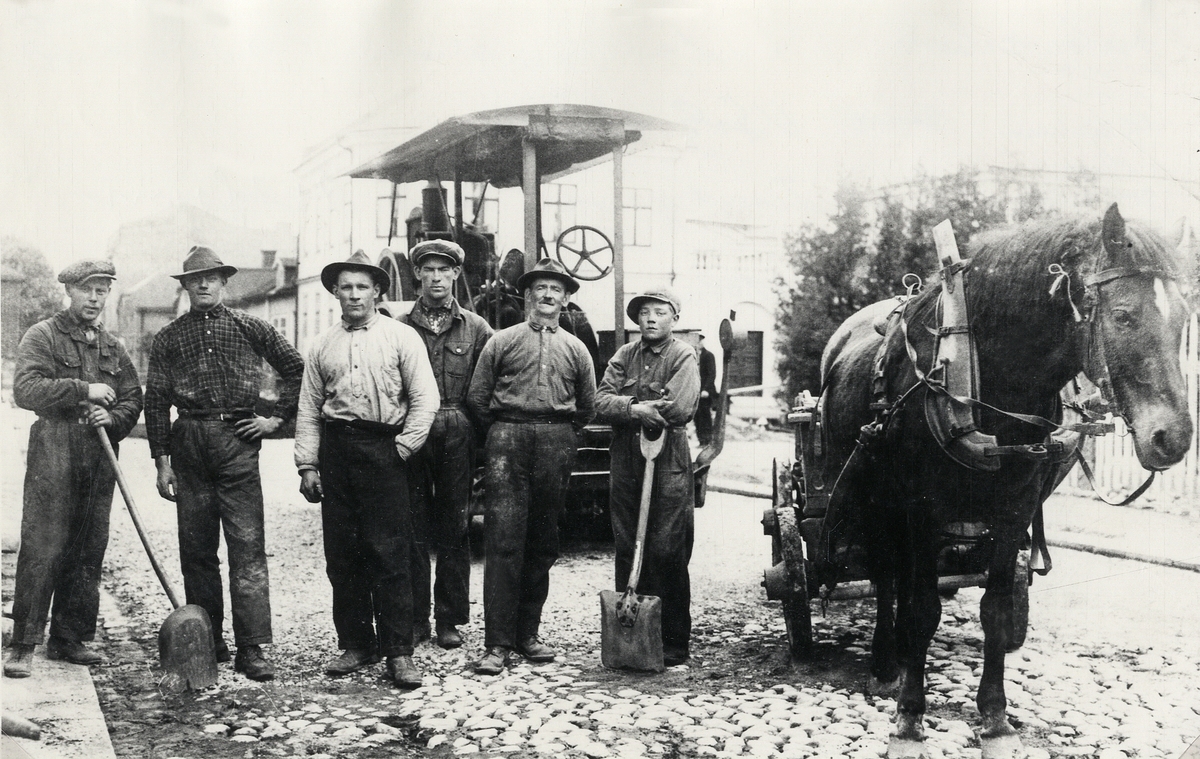 Gatuarbete på Sandgärdsgatan, hörnet Västergatan, ca. 1930.
