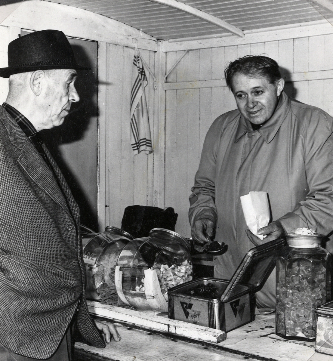 Marknad, Växjö stortorg. F.d. trafikbiträdet Artur Östergren, Växjö, köper karameller av Axel Gjörloff.