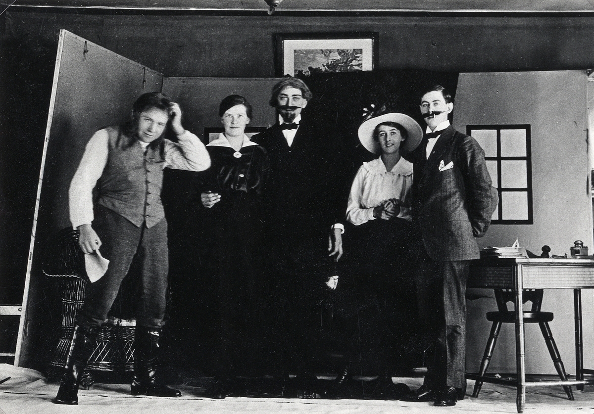 Vilhelm Moberg (t.v.) spelar amatörteater på Grimslövs folkhögskola, 1917.