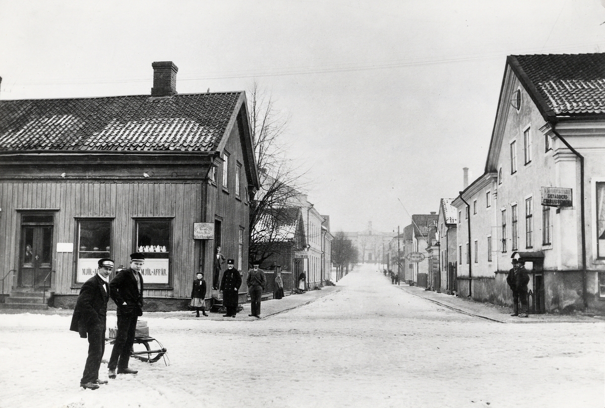 Korsningen Storgatan - Bäckgatan, Växjö, en kall vinterdag ca 1900.