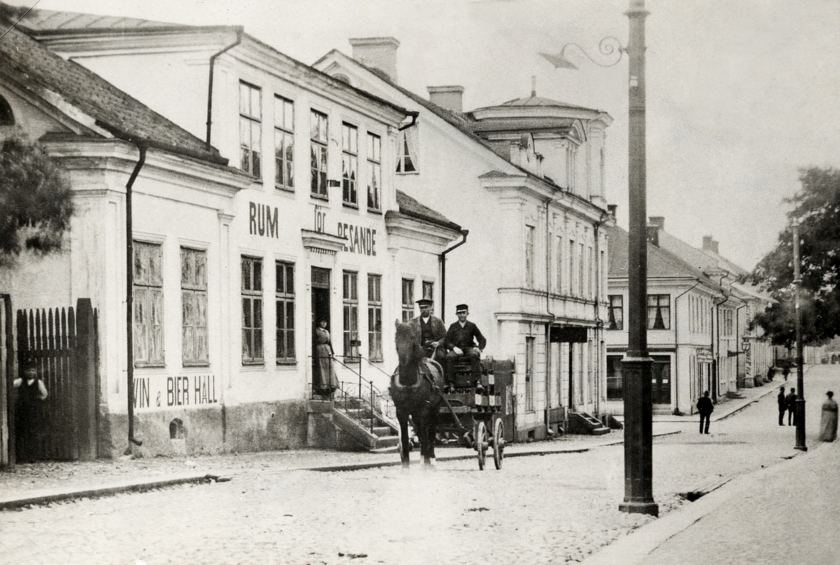 Sandgärdsgatan västerut med Hotell Nyström (kvarteret Linné, nr 2). Fotot trol. taget ca 1890, huset byggdes på med en våning 1895. Man ser ner mot korsningen med Kungsgatan. En hästskjuts passerar framför hotellet.