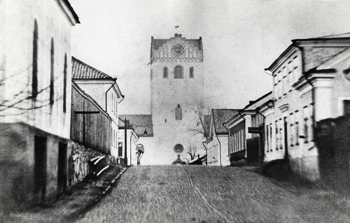 Sandgärdsgatan vid korsningen mot Kungsgatan, med blick österut mot domkyrkan. 1870-tal.