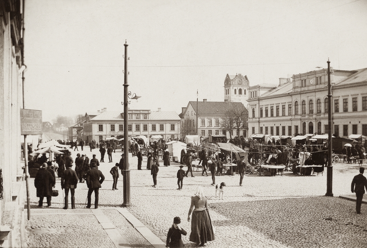 Stortorget, Växjö, hörnet Storgatan / Kungsgatan, 1895. En torgdag med mycket folk i rörelse. Till höger syns dåv. stadshuset och snett bakom detta några av husen i kvarteret Lejonet vid Kronobergsgatan, bl a J.E. Bergs fastighet. Bakom dem syns domkyrkans torn. Långt i bakgrunden skymtar gårdsbebyggelsen vid Östregård.