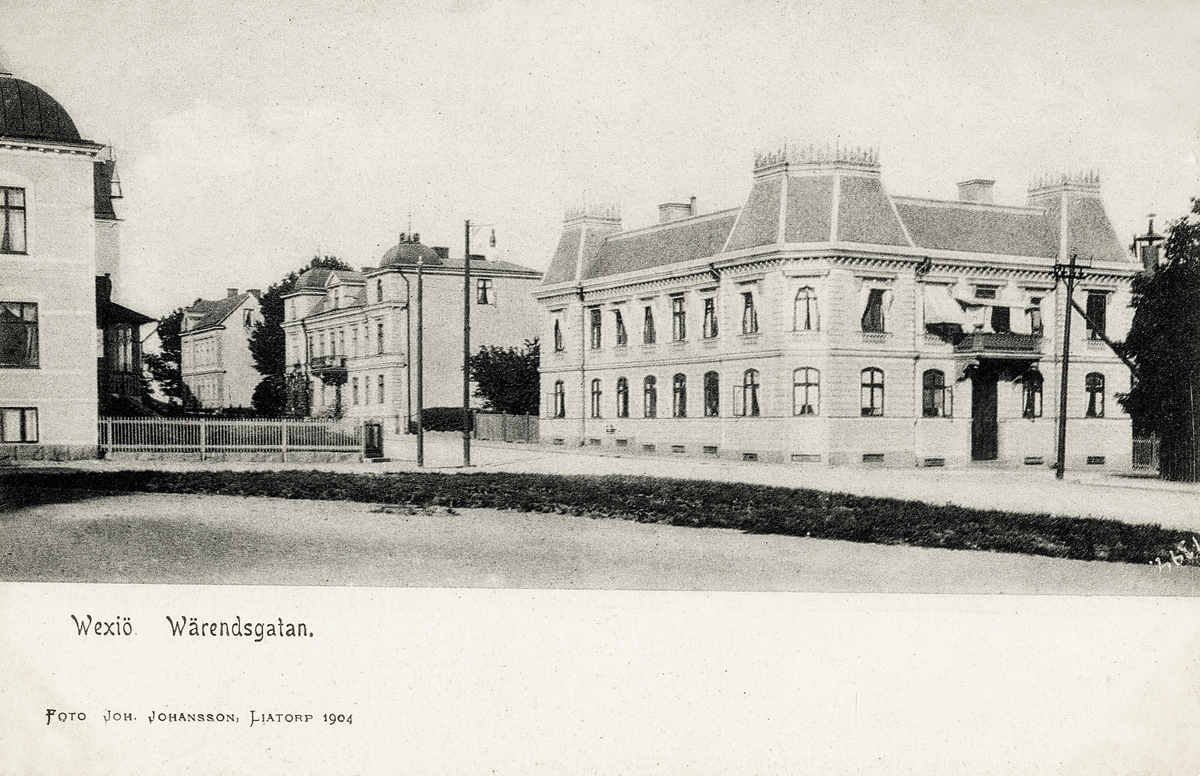 Värendsgatan, Växjö, 1904, från Flickskolans tomt, dvs Trädgårdsgatan. Till vänster skymtar hörnhuset i kvarteret Argus,