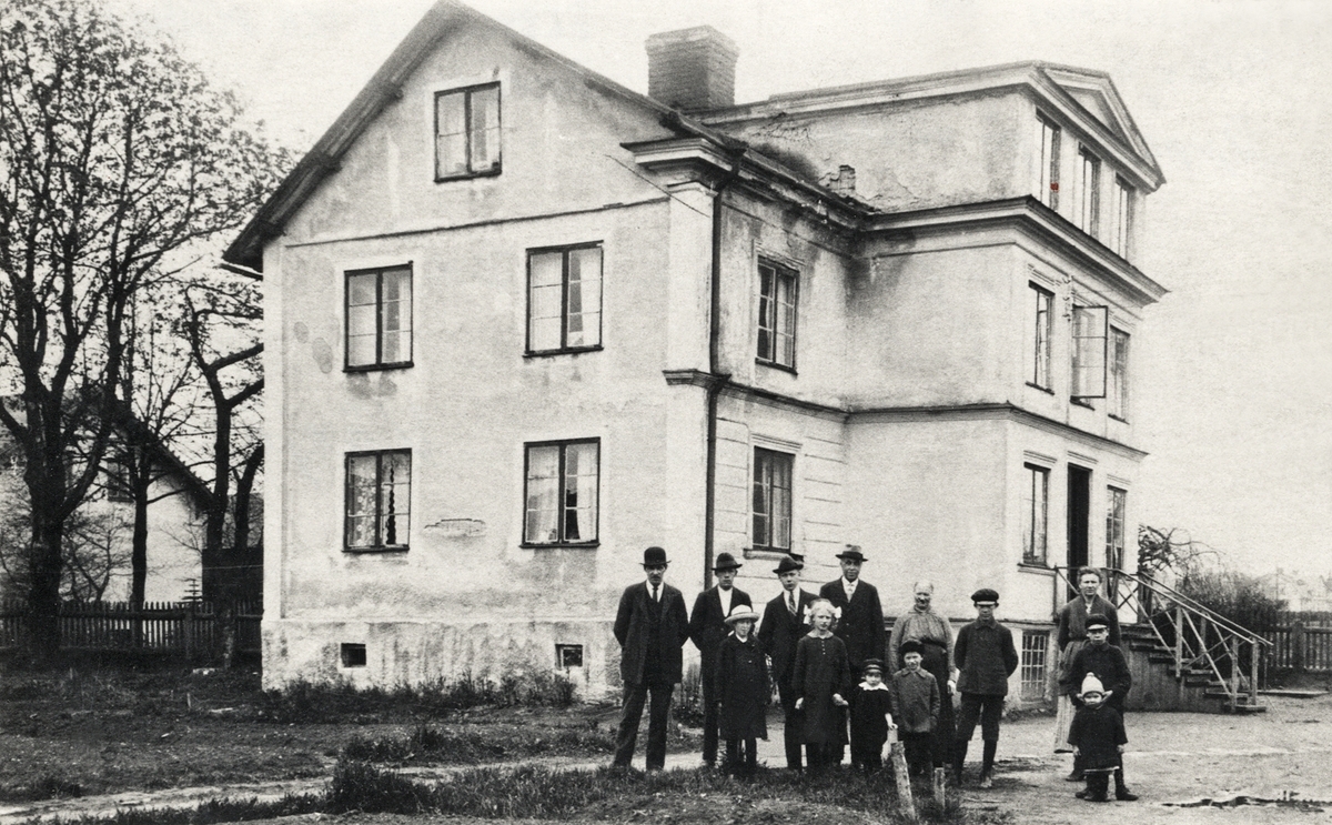 "Djupadal (nr 27)" (senare kv. Loke), Växjö, ca 1920-1925. Fastigheten låg på Södra Järnvägsgatan, som en förgård vid inkörsporten till "Växjö Gjuteri och Mekaniska Verkstad". Hyresgästerna har samlats utanför huset för fotografen.