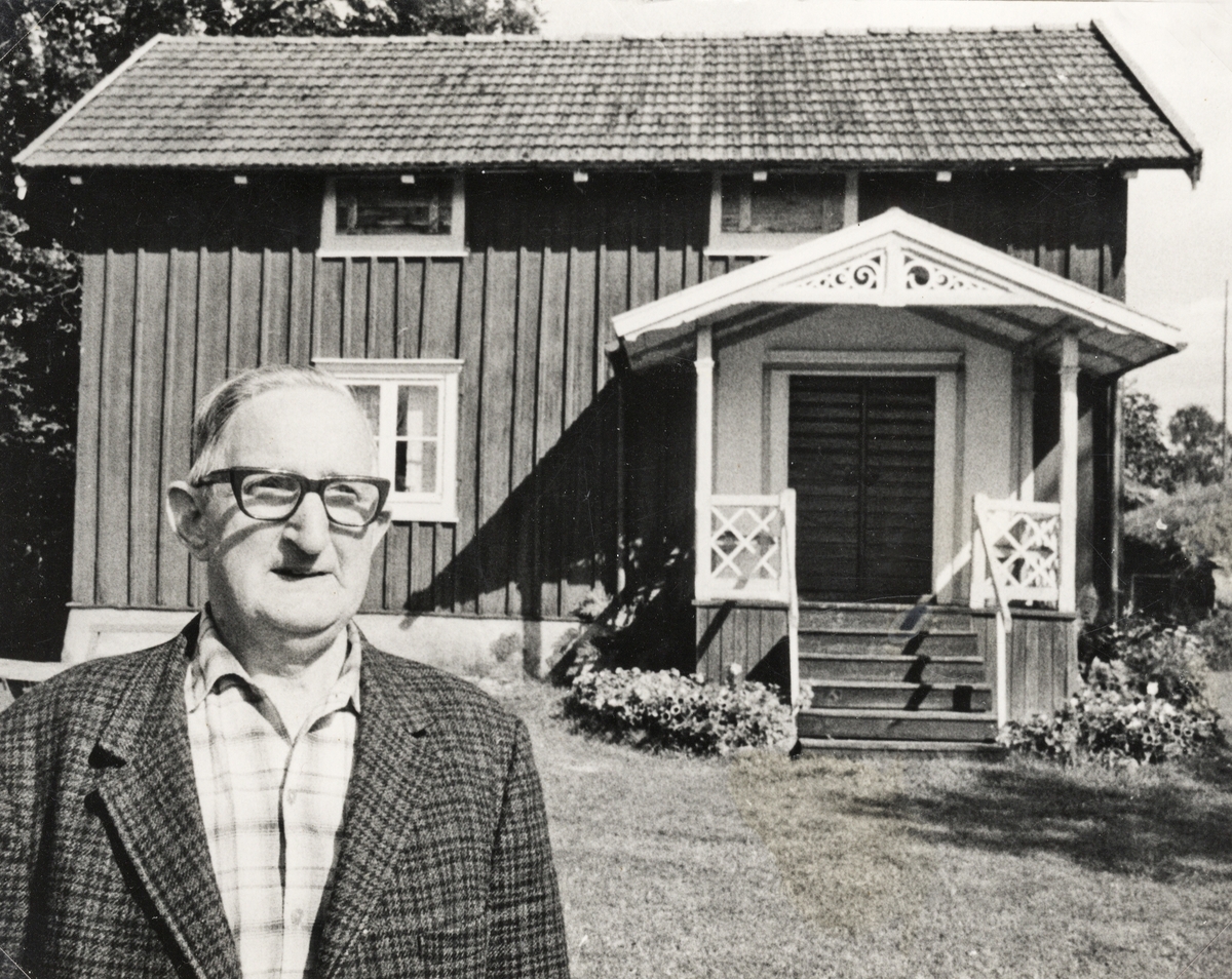 Gustaf Öhrn framför bostadshuset på Stora Lindö, Södra Bergundasjön. 1970.
